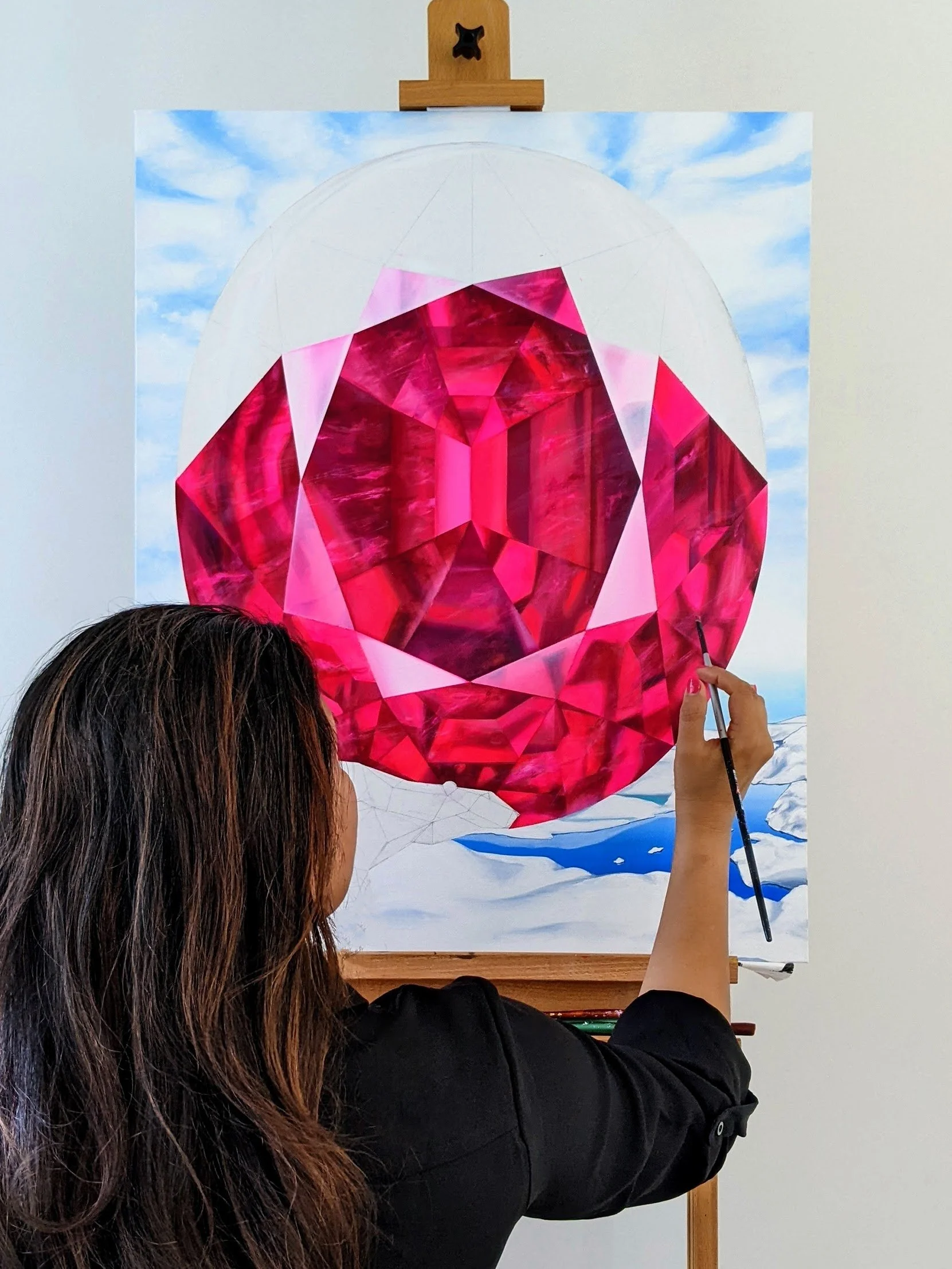 Close-up of the Greenland Ruby painted by artist Reena Ahluwalia.