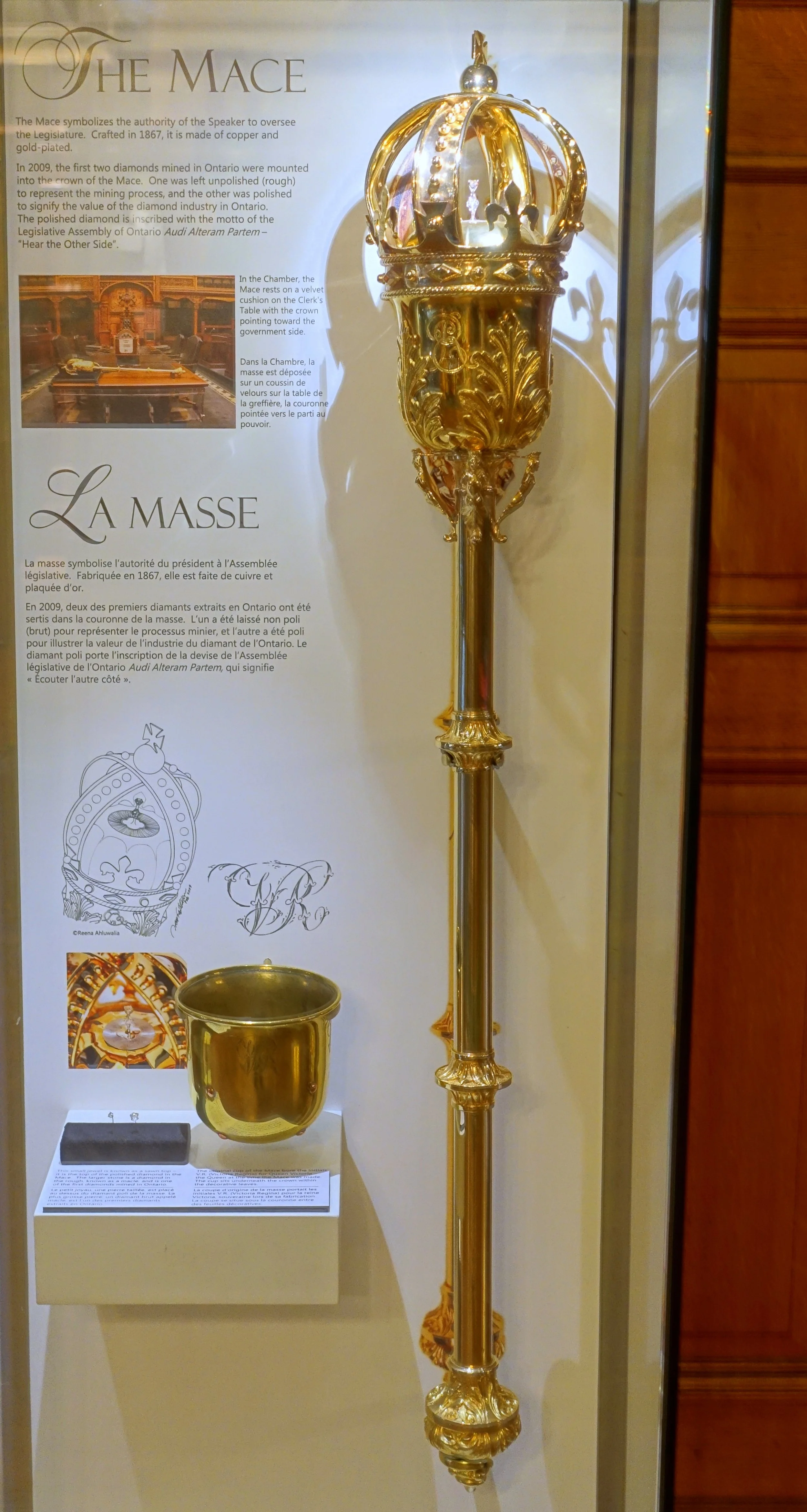 The fourth, and current, mace used by the Ontario Legislature. The Mace is displayed at the Legislative Assembly of Ontario building, and showcases the diamond setting designed by Reena Ahluwalia, as well as her design blueprint with signature. Source: Wikipedia