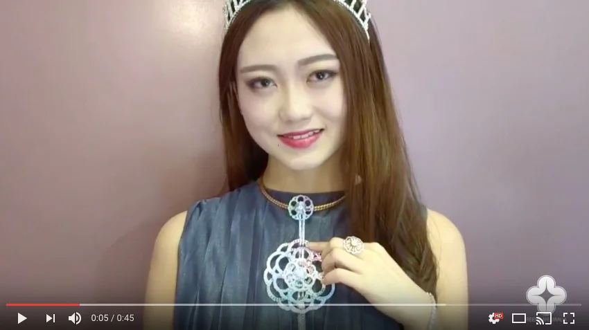 Miss China (Photogenic) Jia Tong Tong wears the 'Soul Carousel' spinning statement necklace. Necklace is studded with Coronet-natural-diamond-setting and Swarovski® Created Color Stones in rainbow palette.